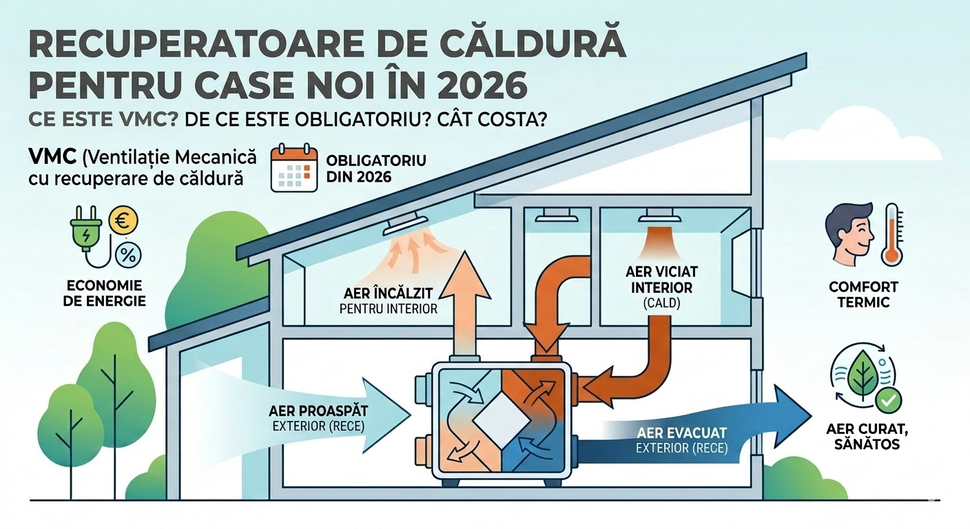 Dacă construiești sau cumperi o casă nouă în 2026, vei auzi tot mai des termenul „recuperator de căldură" sau „VMC" din partea proiectantului sau a constructorului. Nu este un moft — este o cerință legală care se aplică tuturor clădirilor noi din România, cu implicații directe asupra consumului de energie și calității aerului în care trăiești. Acest ghid îți explică ce este, de ce este obligatoriu, cât costă și cum alegi corect.
