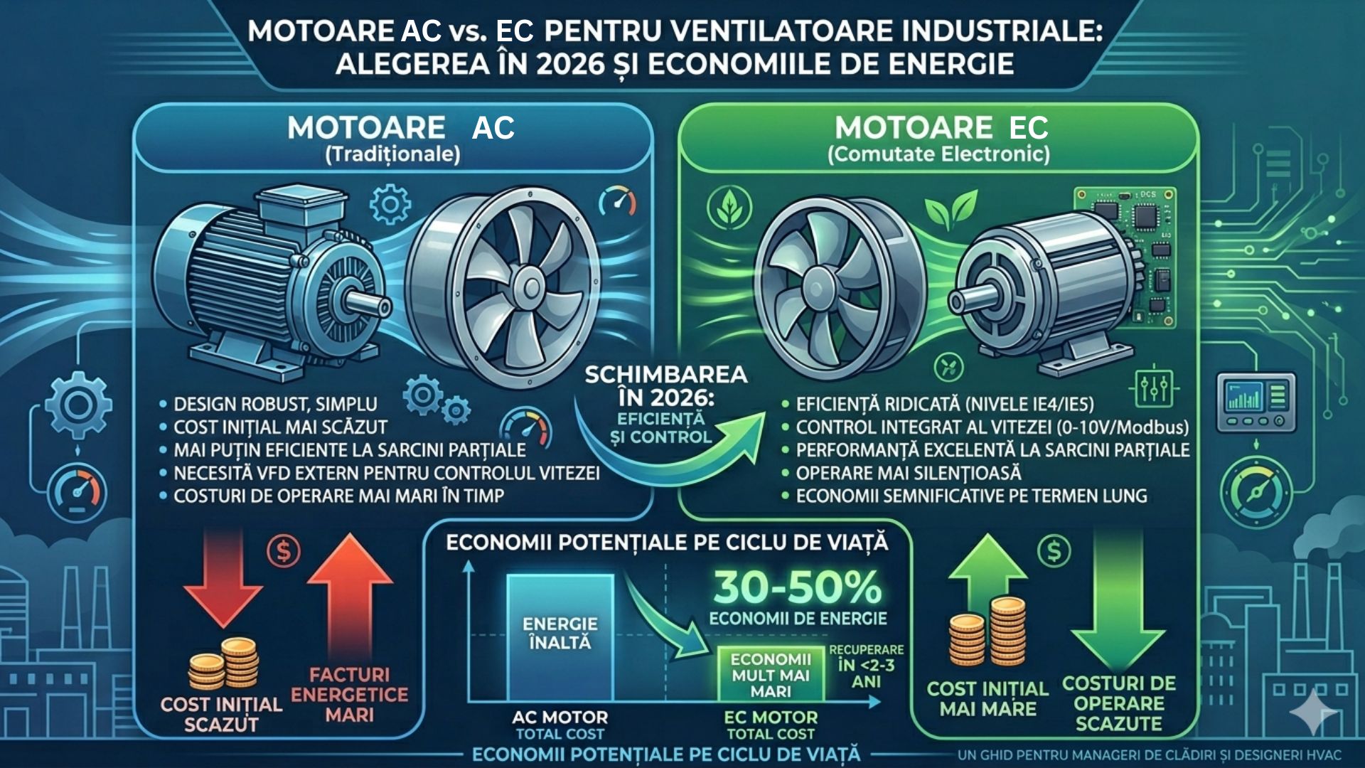 Ventilatoarele industriale și comerciale funcționează 8, 12, uneori 24 de ore pe zi. Consumul lor energetic nu este o cifră abstractă pe o fișă tehnică — este o factură lunară reală care crește an de an odată cu prețul energiei electrice. Diferența dintre un ventilator cu motor AC clasic și unul cu motor EC (Electronically Commutated) poate însemna economii de 40–70% din energia consumată de sistemul de ventilație, ceea ce la o instalație medie se traduce în mii de lei pe an.
